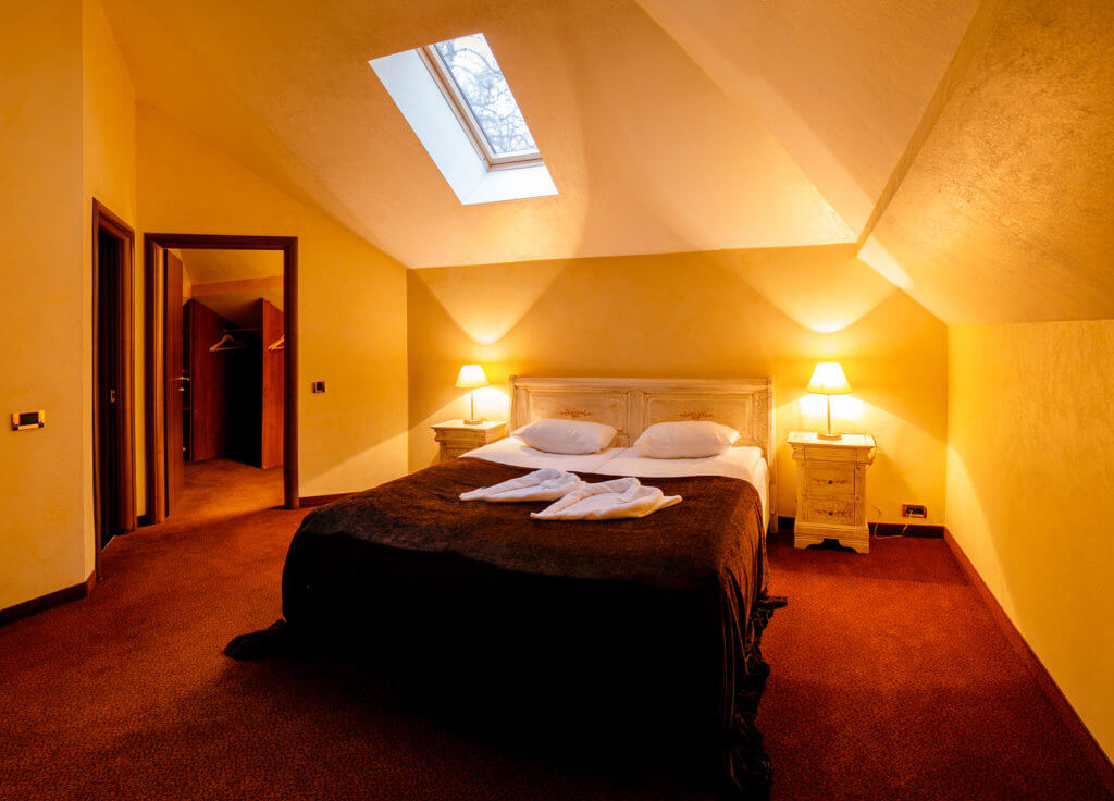 Трехуровневый – около 90 кв.м. Три спальни – одна двуспальная кровать в каждой, две Гостиные (проходные комнаты) – в одной из гостиных стоит длинный стол на 6 персон, во второй раскладной диван-уголок (2 доп.места). В номере сейф, мини-бар за доп.оплату, 4 плазменных ТВ (в спальнях и в гостиной), четыре санузла – три основных и один гостевой (в основных – в двух джакузи, набор косметики, фен, халаты и тапочки, в одном – ванная, набор косметики, фен, халаты и тапочки, в гостевом –раковина, унитаз).