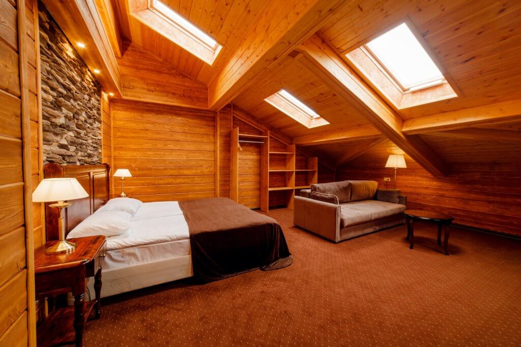 “СТАНДАРТ ПЛЮС МАНСАРДНЫЙ” – однокомнатный номер, площадь по полу ~ 42 кв.м., из них спальня 34 кв.м., ванная комната – 8 кв.м. (подсобная комната 12 кв.м.) Номера расположены на 4м этаже (лифта нет), МАНСАРДА. В номере установлена одна двуспальная кровать, раскладной диван (2 доп.места). В номере сейф, мини-бар за доп.оплату, плазменный ТВ, в санузле ванная, набор косметики, фен. Максимальная вместимость – 4 чел, включая детей.